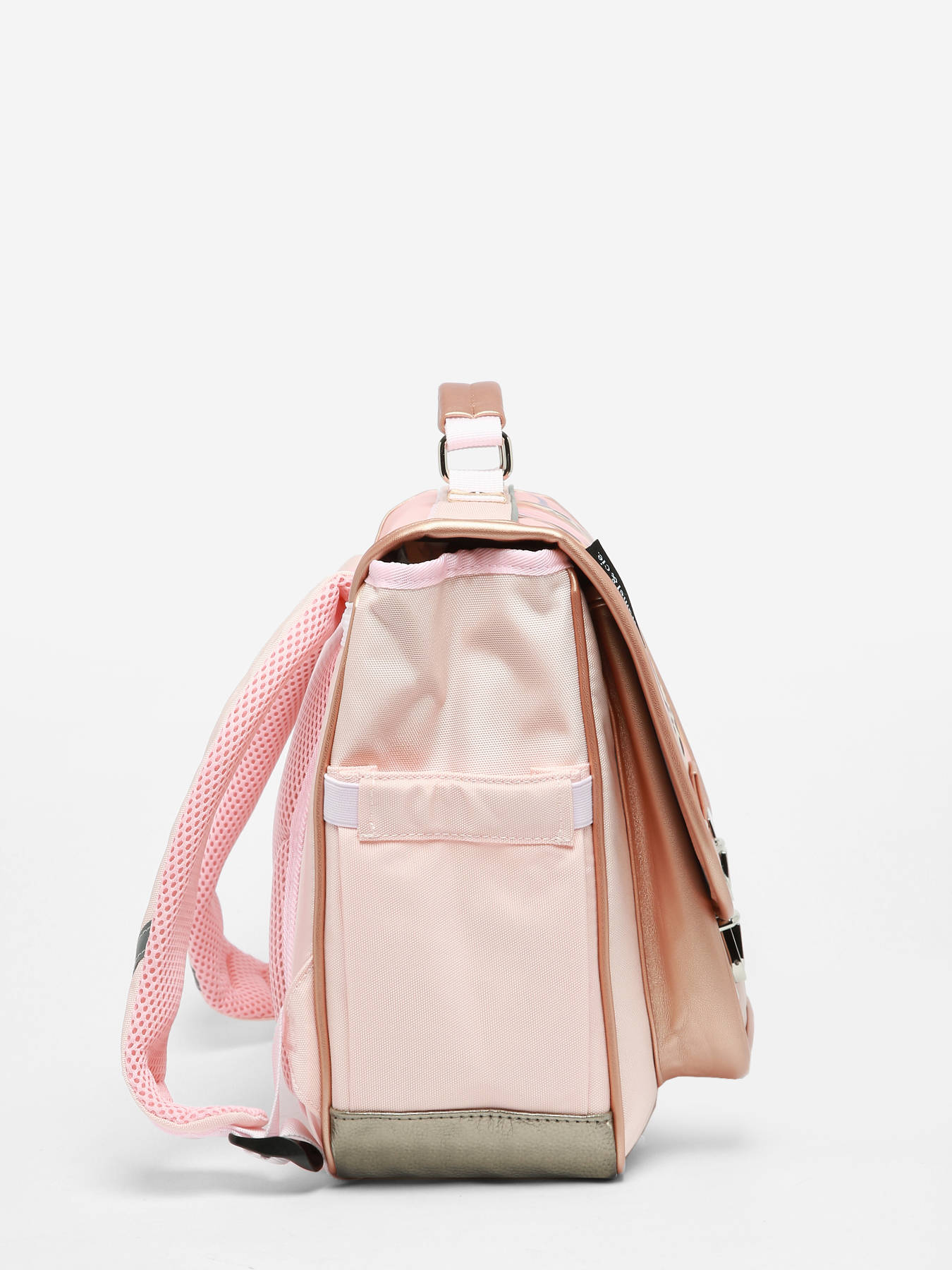 De boekentas heeft een mooie kleur (niet te rose) en tof ontwerp. Ze is stevig, zowel binnen- als buitenkant, en comfortabel om te dragen. Heel erg handig is het flesje aan de buitenkant. Dat geeft ruimte aan koekjes- en boterhamdozen in de tas zelf.